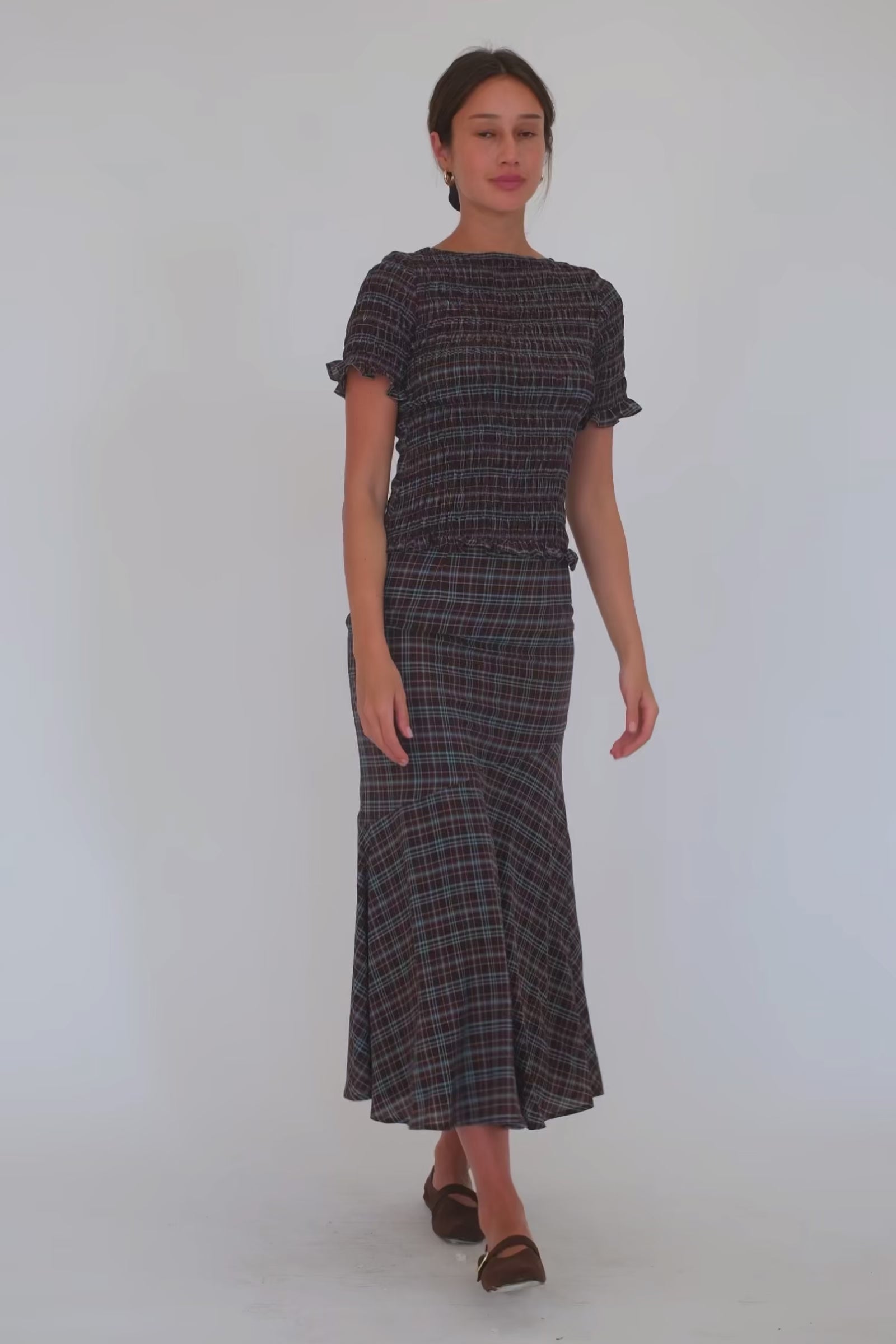 Heritage Check Chiffon Smocked Frill Sleeve Top