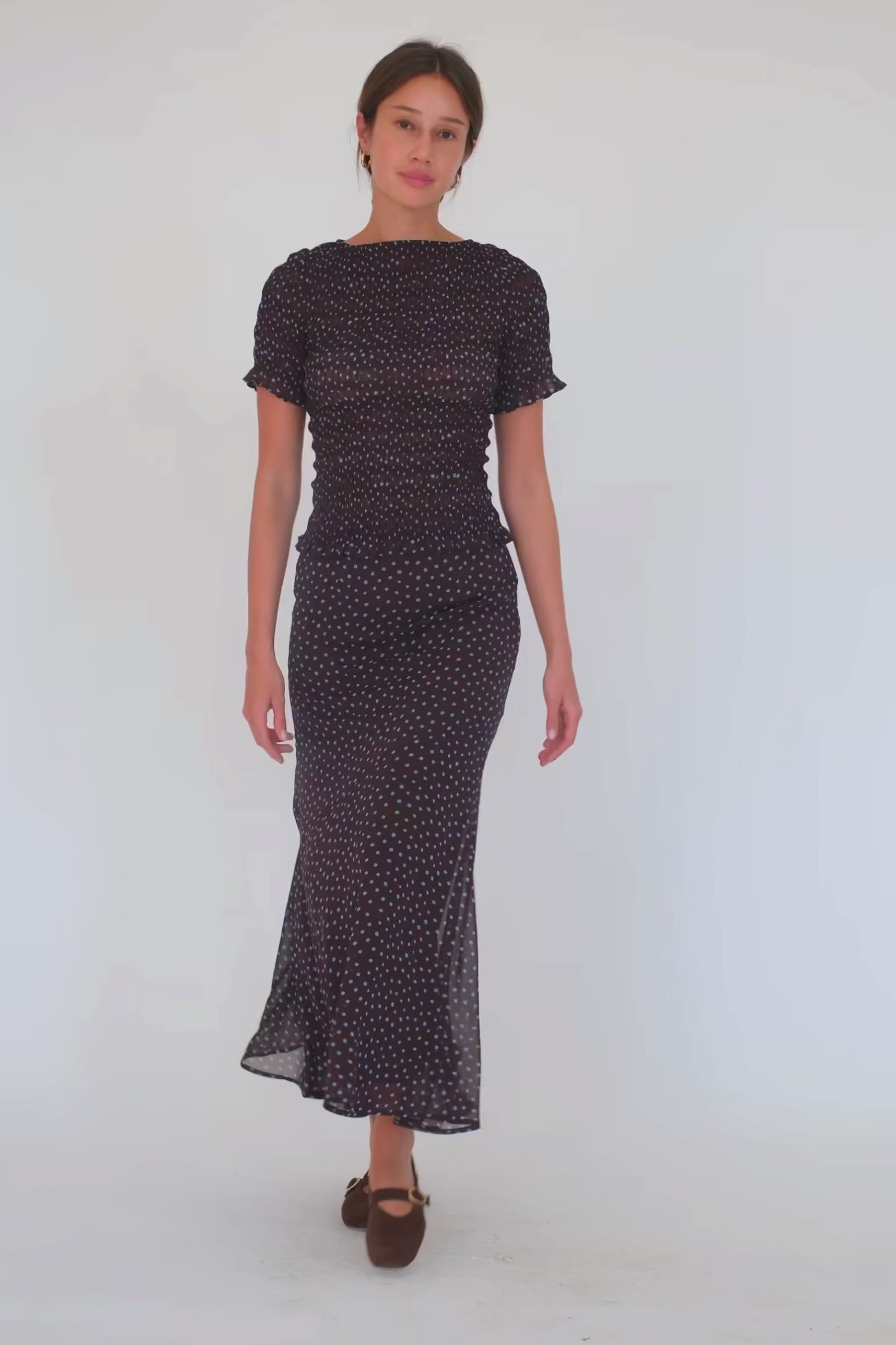 Polka Dot Satin Smocked Longsleeve Midaxi Dress
