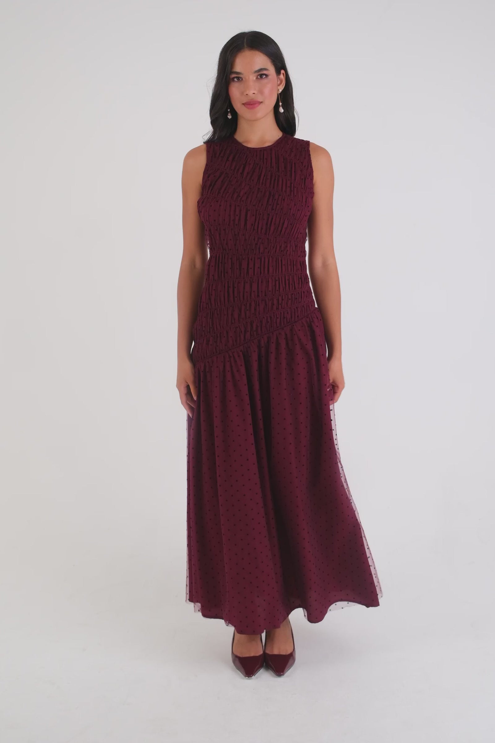 Polka Dot Satin Smocked Longsleeve Midaxi Dress