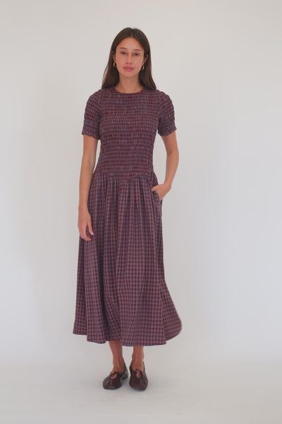 This midaxi dress features a heritage check pattern, a comfortable shirred bodice, and a drop waist that flows into a gently gathered skirt. With short sleeves and a relaxed fit, it's an easy go-to for casual events, or daytime outings