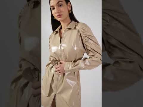 Simply stunning faux leather above the knee dress with exposed front statement zip fastening and self covered belt on the waist. Intricate ruche detailing on the sleeves creates a stunning effect and elevates this modern take on the classic shirt dress. Loving this worn with heels for a night out!
