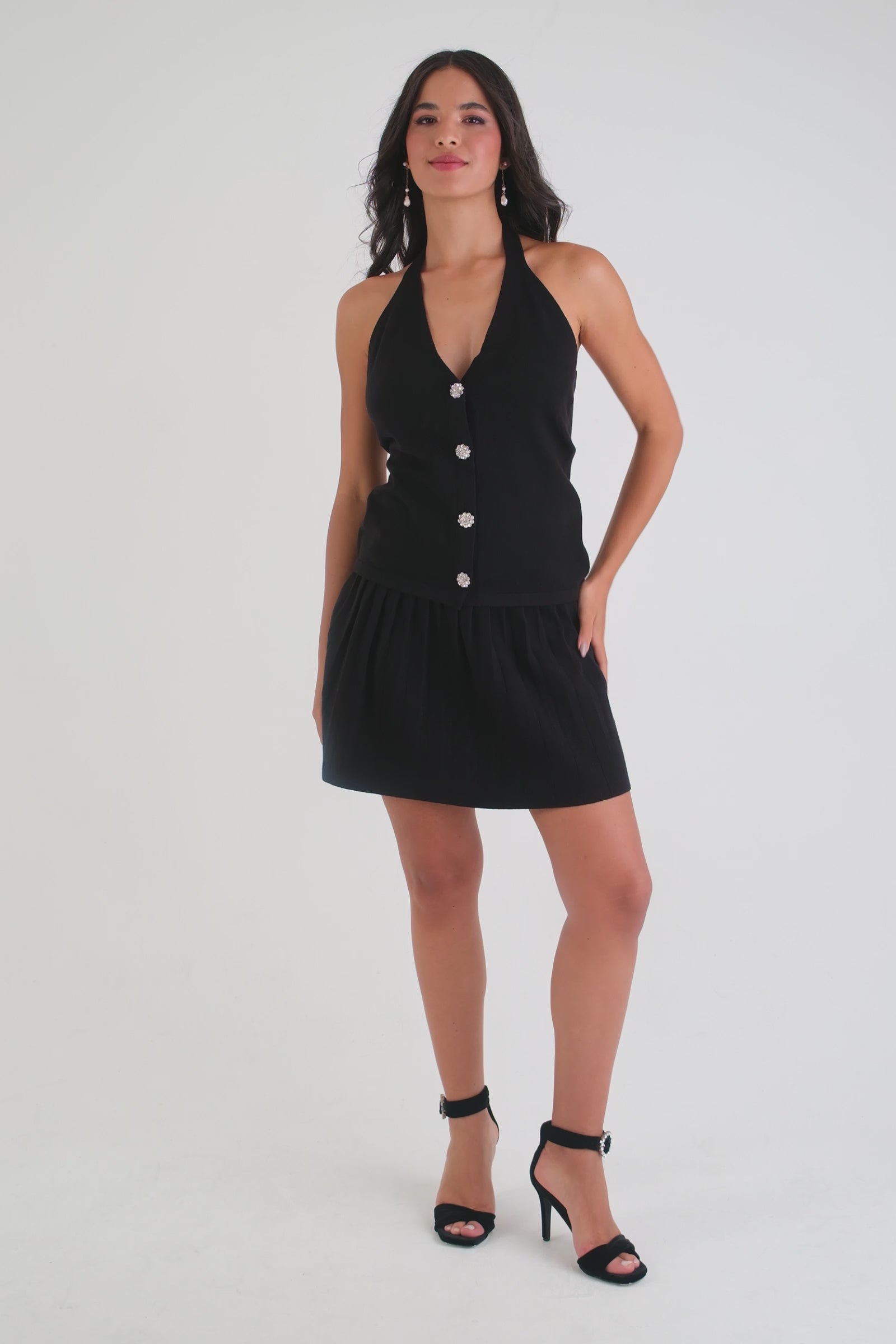 Refined yet playful, this halter-style knit top features a deep V-neckline and embellished buttons down the front. With its sleek, body-hugging silhouette, it’s ideal for evening dinners, rooftop gatherings, or going-out looks that call for something elevated but effortless.