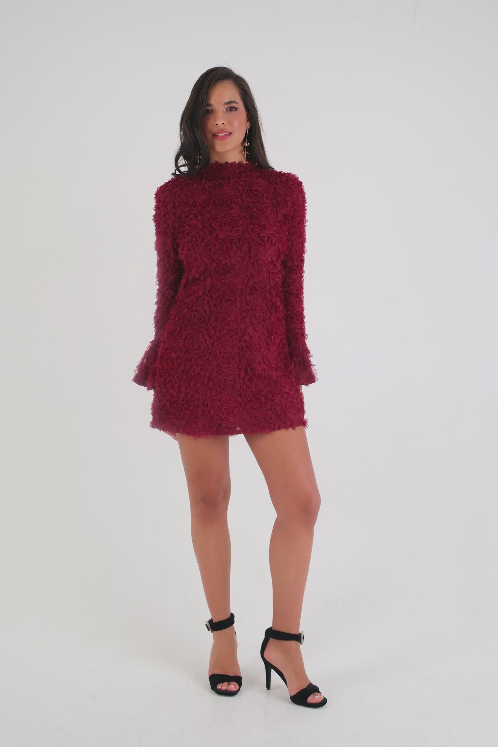 Rich in texture and romantic in silhouette, this mini dress is crafted from a 3D floral fabric that brings depth and dimension to every detail. The high neckline and long sleeves offer a sense of refinement, while the soft flare at the cuffs adds a subtle, vintage-inspired touch. Designed in a flattering A-line shape, it’s the perfect blend of statement and simplicity—ideal for weddings, winter soirées, or any event that calls for something a little extra.