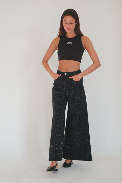 Back by popular demand, our best-selling wide-leg jeans return in a new black stretch denim scattered with silver diamanté embellishments for a subtle shimmer. Designed with an ultra-flattering, high-waisted fit, ultra-wide legs, and classic pocket detailing front and back, they offer both comfort and standout style. Perfect for Christmas events, festive nights, or dressing up for day-to-night wear, these jeans bring a little sparkle to any look.