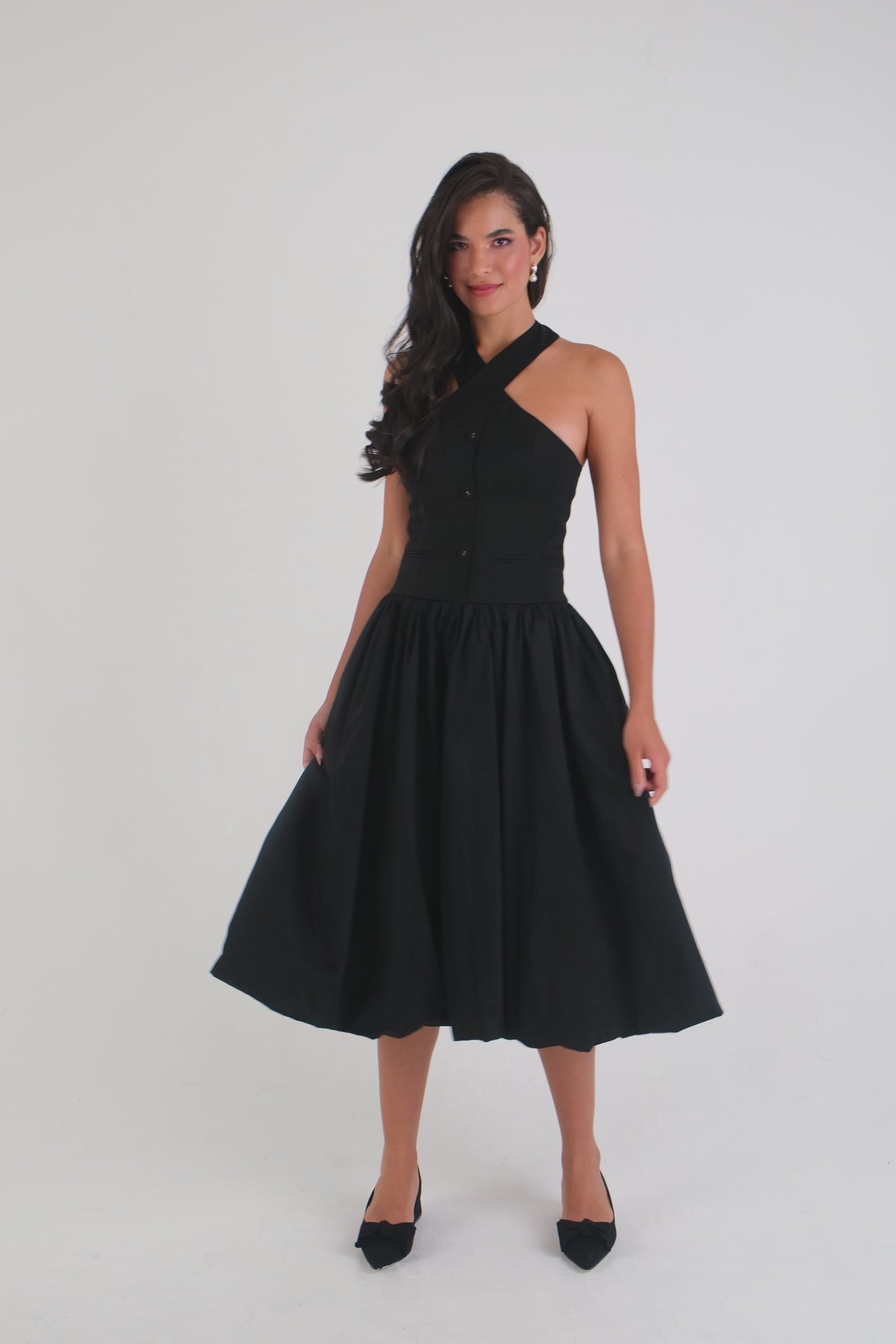 Halter neck style midi dress with button neck fastening.