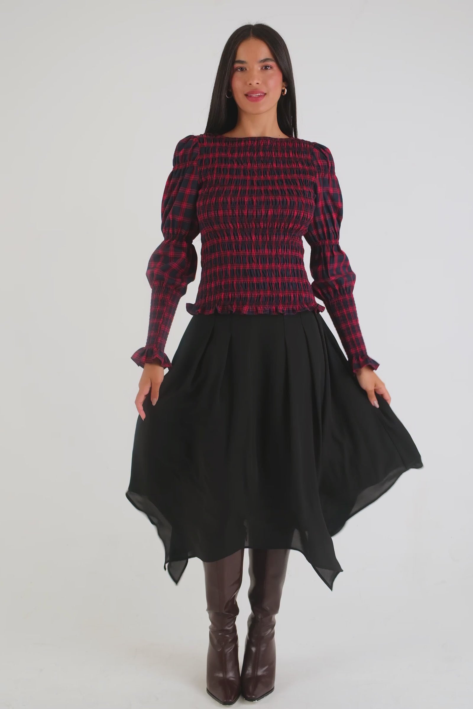 This 100% cotton top features a striking red-and-navy heritage check. With full-body shirring, softly puffed shoulders, and long sleeves finished with flared cuffs, it balances structure and stretch. The square neckline and ruffle hem add subtle shaping, making it easy to dress up or down — perfect for casual days or evening plans.
